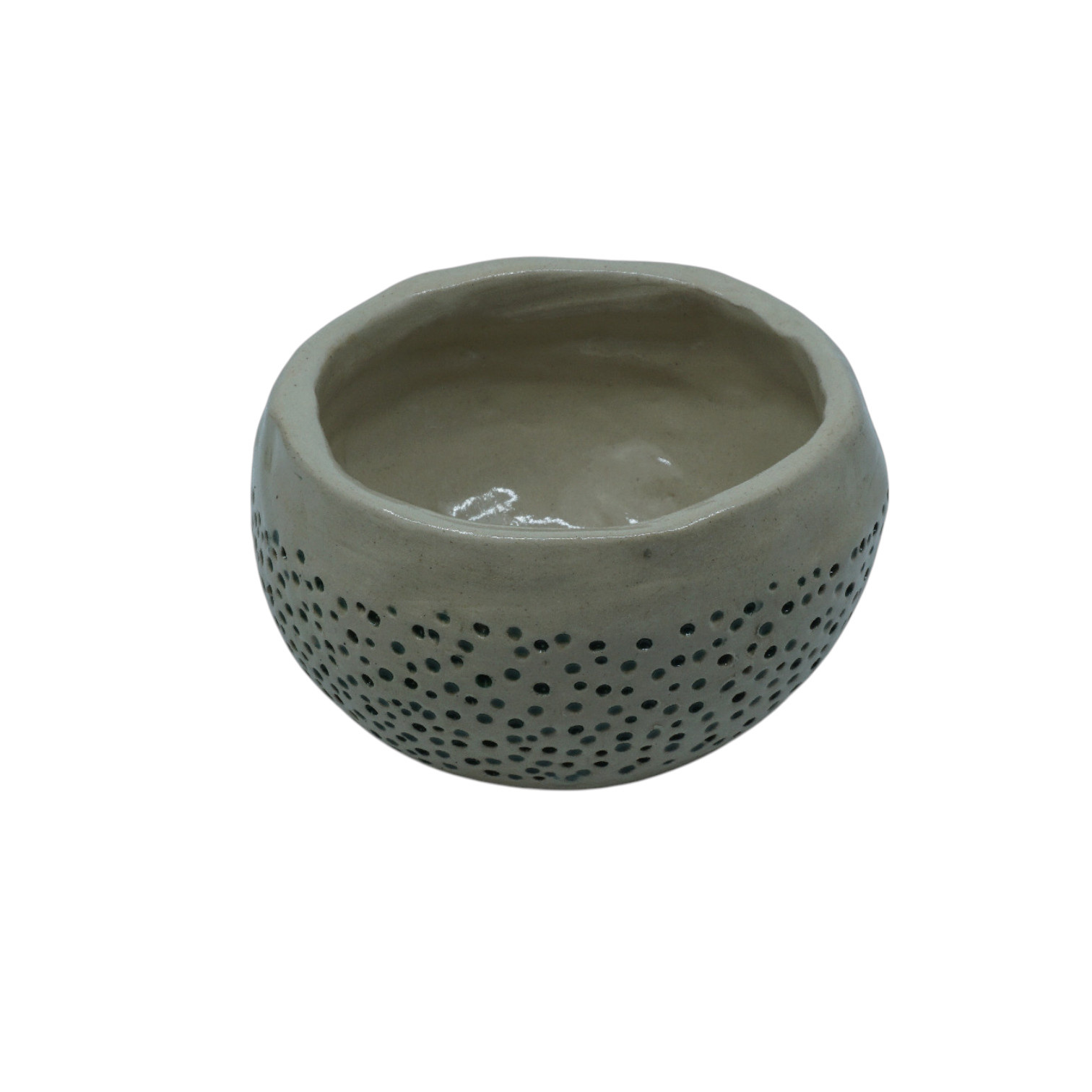 Handgefertigte Teelichtschale aus Keramik beige mit grünen Punkten