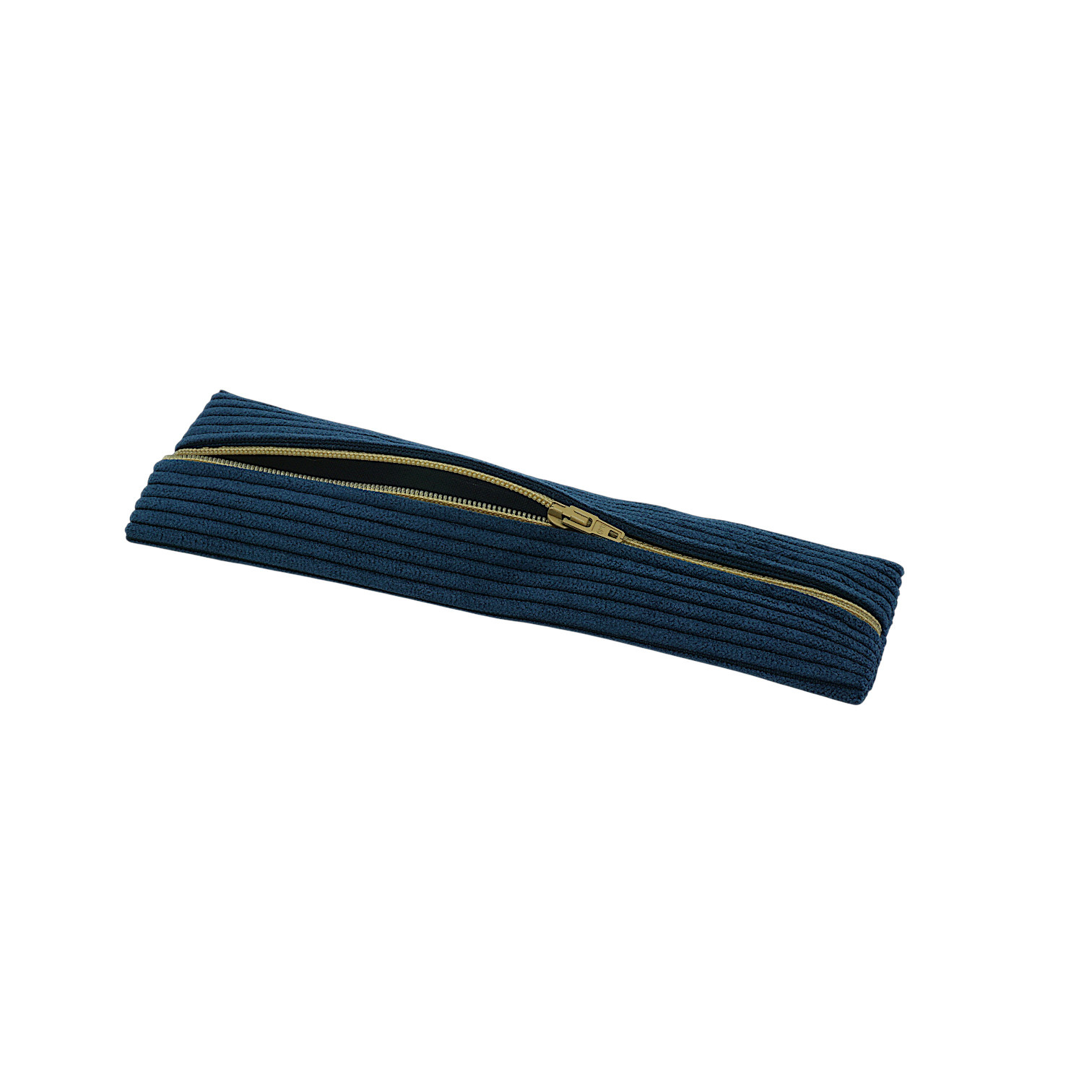 Blaues Penal aus Cord mit beigem Reißverschluss