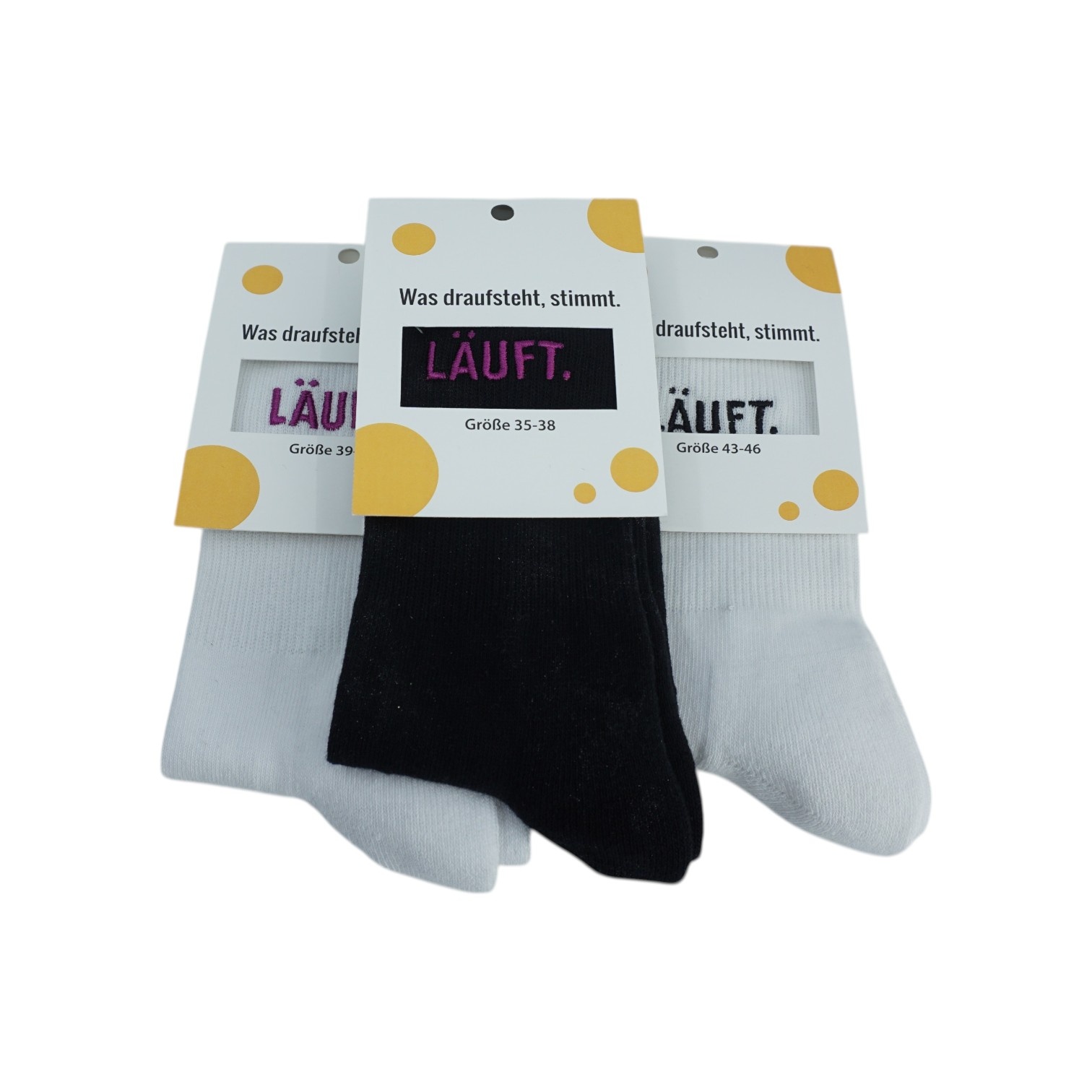Diese weißen Socken mit dem schwarzen Schriftzug „LÄUFT.“ sind schlicht, modern und gleichzeitig ein echter Hingucker. Das minimalistische Design passt zu vielen Outfits und bringt mit dem kurzen Statement eine Portion Humor in den Alltag.